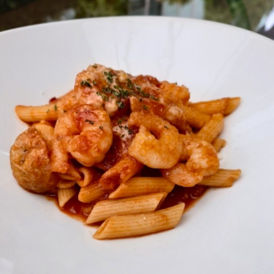 ホタルイカとアスパラのトマトパスタ デュガスチーズ添え